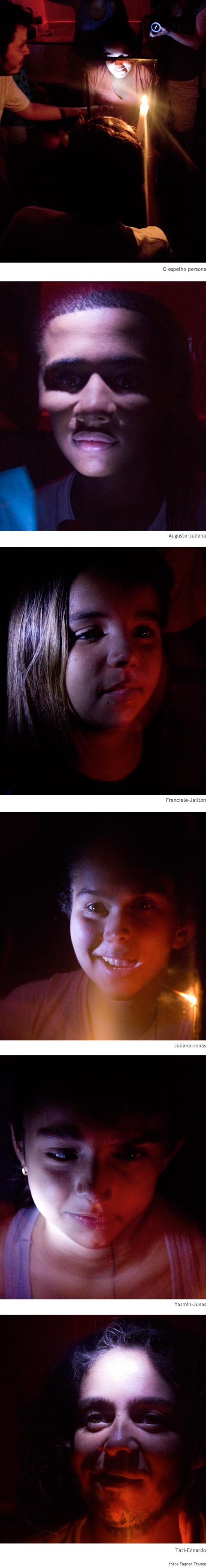 O espelho funciona assim: cada um senta de um de seus lados e ilumina uma parte do rosto. As partes não iluminadas somem e as outras se fundem. Nos divertimos juntando nossos rostos, criando seres hibridos e prá lá de estranhos.